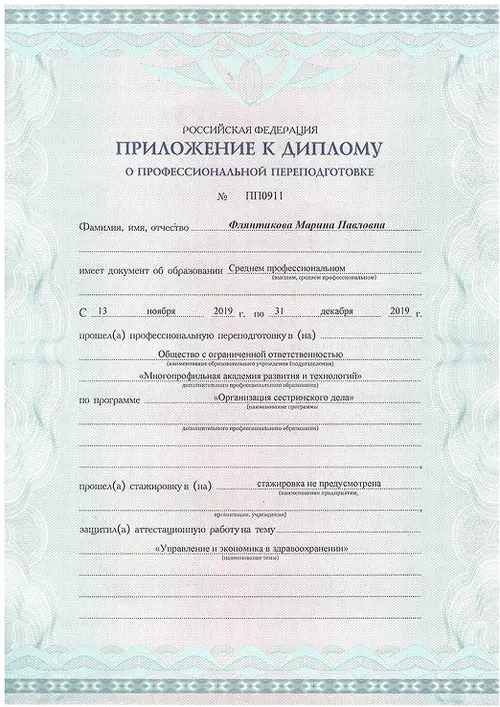 Флянтикова Марина Павловна, закончила ООО “Многопрофильную академию развития и технологий” по направлению - Сестринское дело.